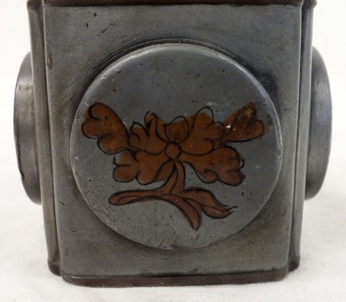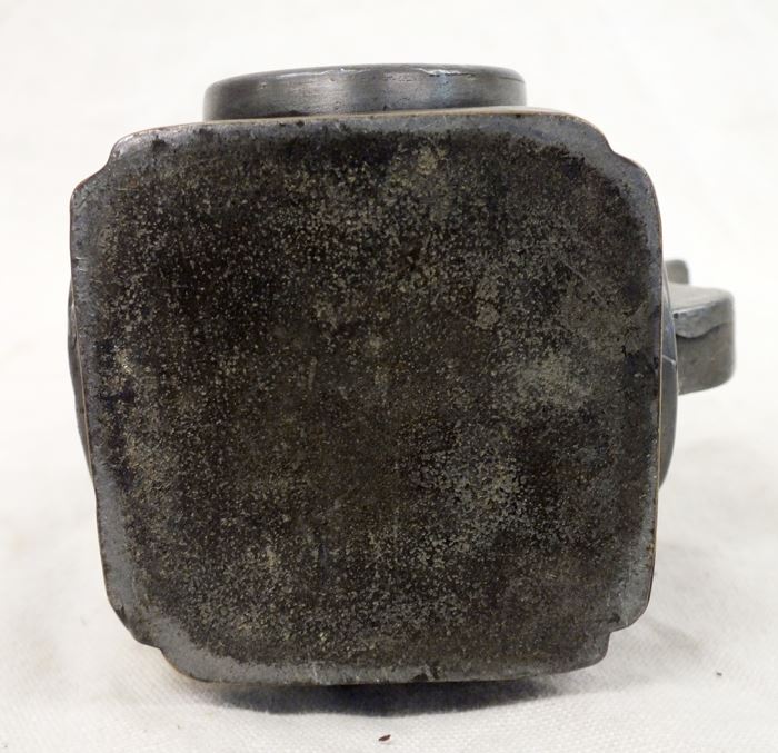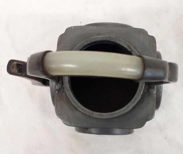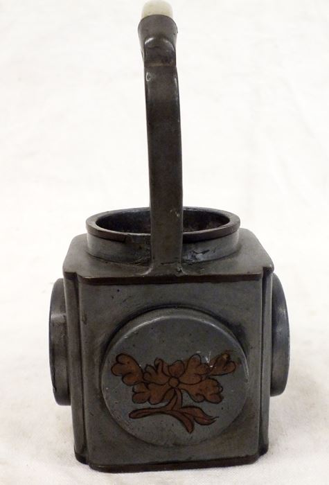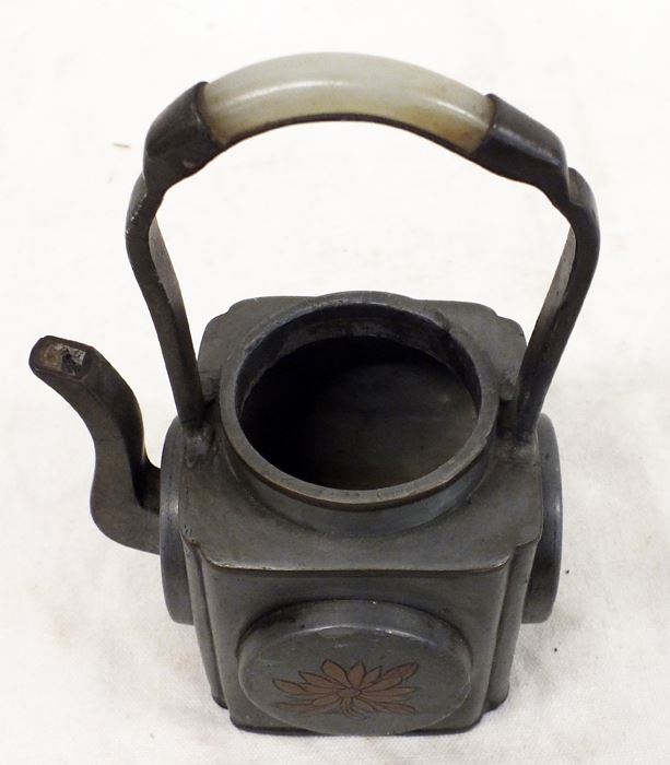 Chinese pewter tea pot with jade handle. 5 1/2" tall, 3 3/4" wide, weight 1 Lb. No lid.