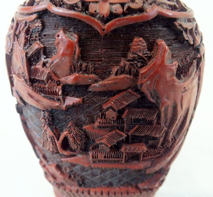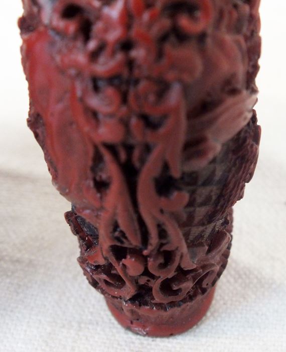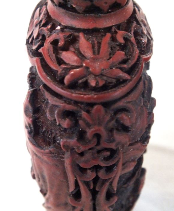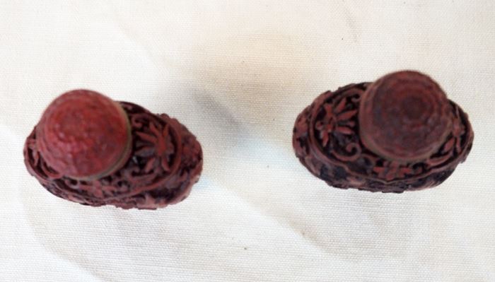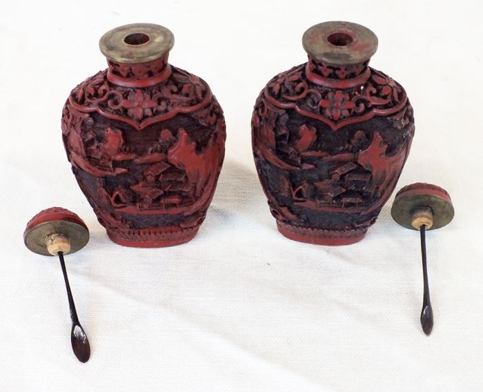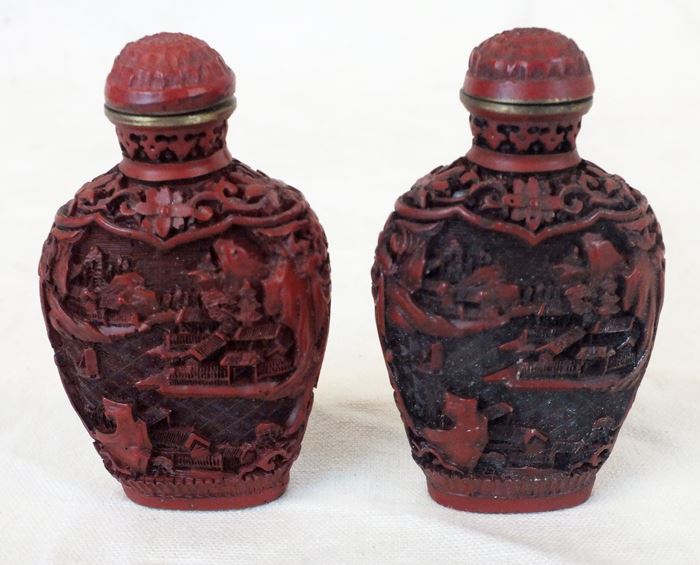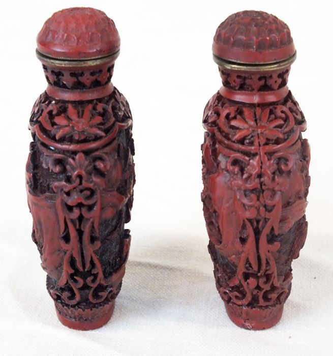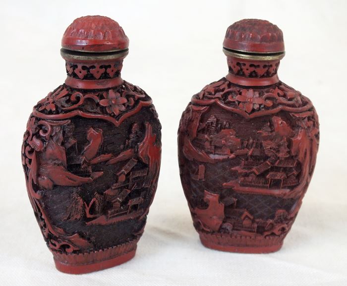 Pair of Chinese cinnabar perfume / snuff bottles 3" tall, marked on the bottom.
